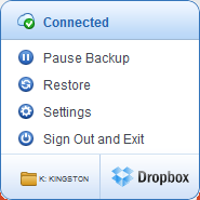 A quick way to log in to your cloud storage is to click on the selected cloud icon in the USBtoCloud menu (see image below: this example lists Dropbox).