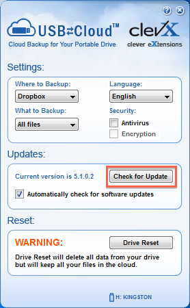 We are continuously working to improve and enhance the USBtoCloud application and make updates available at any time without prior notice. USBtoCloud application is designed to perform an automatic check for updates every time you insert your drive, but this feature can be disabled in the Settings menu.